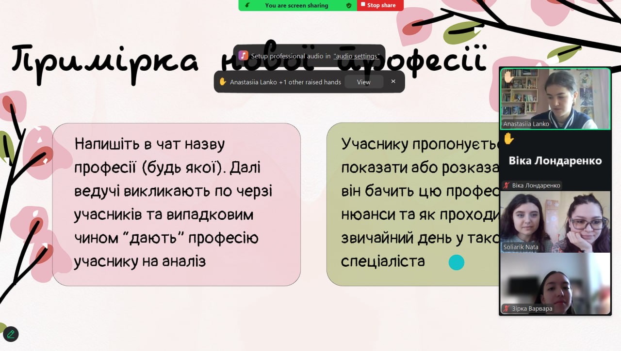 – обговорили результати вправ та можливі професії, що обговорювали та приміряли на себе учасники у ході тренінгу;
